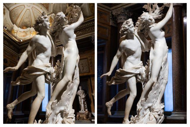 אולם אפולו ודפנה בגלריה בורגזה (Galleria Borghese) אינו מקרי. הפסל ממוקם כך שהאור הטבעי החודר מהחלונות מדגיש את תנועת העלים והגוף. האור מחליק על השיש ויוצר תחושת תנועה חיה.