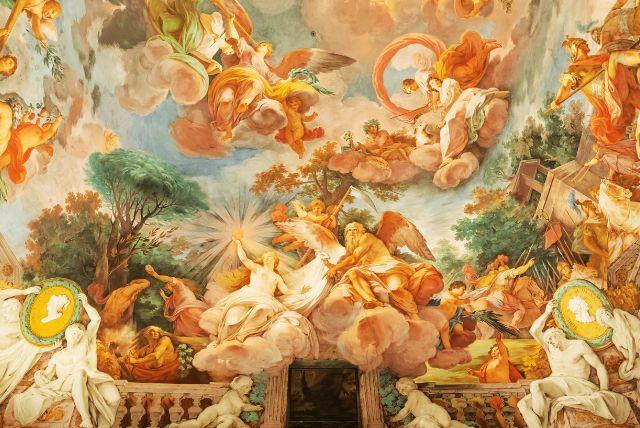 המשמעות העמוקה של האולם מתגלה רק כאשר מרימים את העיניים. האמנות העליונה אינה עומדת מעל הפסלים במקרה, אלא משלימה אותם באופן רעיוני, אסתטי ורגשי. זוהי דוגמה מובהקת לאידיאל הברוקי של אחדות אמנותית, שבו כל אלמנט – מהקרקע ועד התקרה – שותף ליצירת דרמה שלמה ומלאת השראה.
