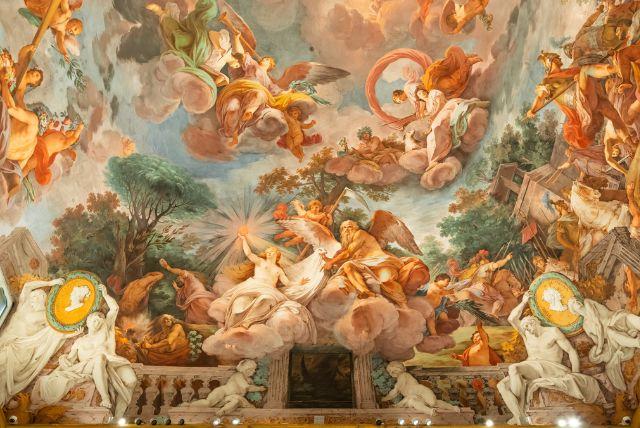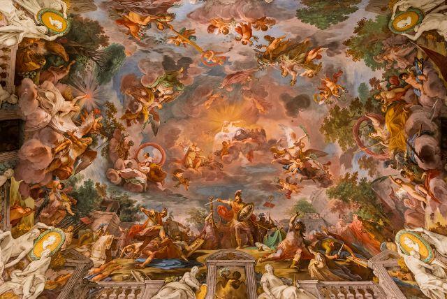 התקרות בקומה הראשונה מרחיבות את גבולות החדר אל עולם מיתולוגי מדומיין. הן אינן רק קישוט אלא חלון רעיוני כלפי מעלה. האשליה של שמיים פתוחים יוצרת תחושת התעלות. הצופה מוזמן להביט אל מעבר לגבולות הארכיטקטורה.
