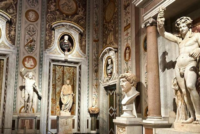 החוויה במקום שונה ממוזיאונים ארכיאולוגיים טהורים, מפני שהפסלים מוצבים בתוך חללים בארוקיים עשירים בפרסקאות ובקישוטי תקרה. הדיאלוג בין העת העתיקה למאה ה-17 יוצר מתח אינטלקטואלי מרתק. כל גוף שיש לבן מקבל עומק נוסף כאשר הוא מוקף בעיטורים צבעוניים ותקרות מצוירות. המפגש הזה מדגיש עד כמה העולם הקלאסי שימש בסיס לתרבות האירופית המאוחרת.
